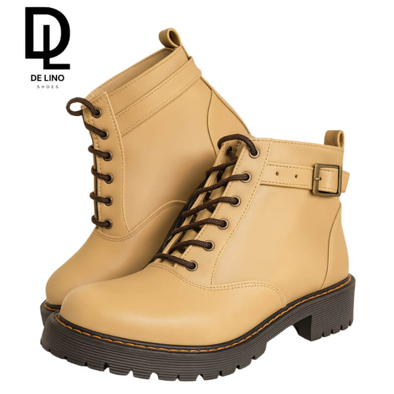 Botín artesanal de piel con agujetas y correa ajustable. Tacón bajo, confort excepcional y estilo urbano para caminatas largas o uso diario.