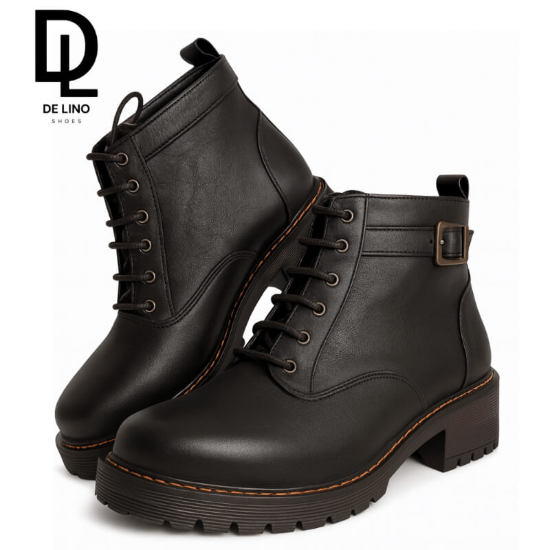 Botín sintético con tacón bajo, agujetas y correa ajustable. Comodidad urbana para caminatas largas, días activos o estilo casual con personalidad.